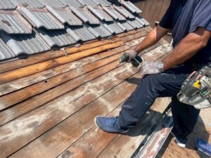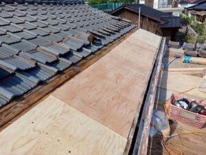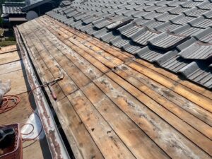 今回はこちらのルーフィングと野地板を新しくやり替えて瓦をもとに戻す工事になります。