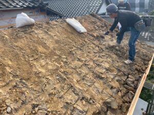 その上に粘土を乗せ、その粘土の接着力で瓦を固定していく工法です。