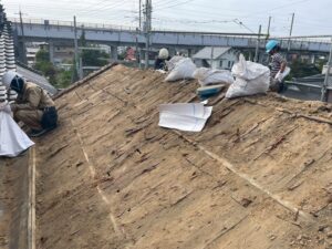 こちらは泥葺屋根のため、泥と瓦を撤去していきます。